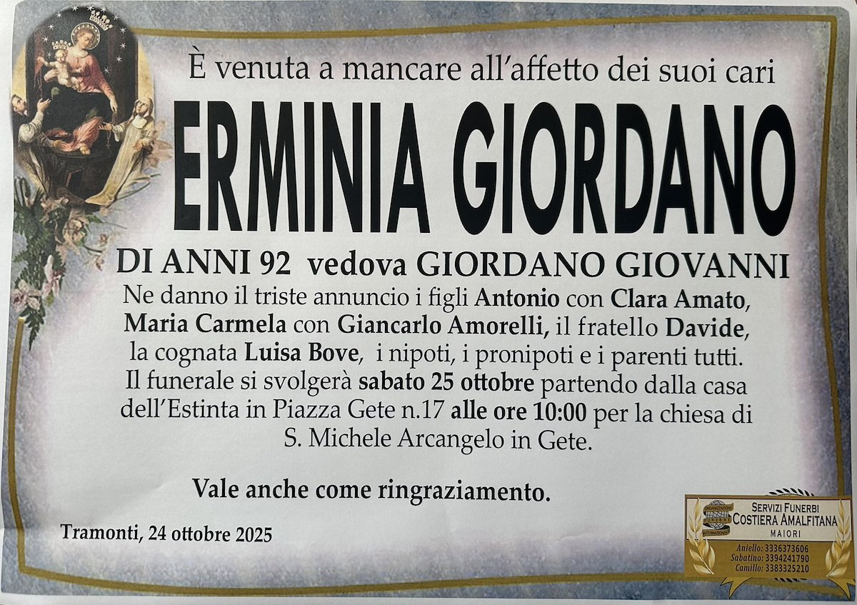 Anche la redazione di Maiori News si unisce al dolore della famiglia Giordano, esprimendo sentite condoglianze al dottor Antonio Giordano e ai suoi cari per la perdita della cara mamma Erminia.