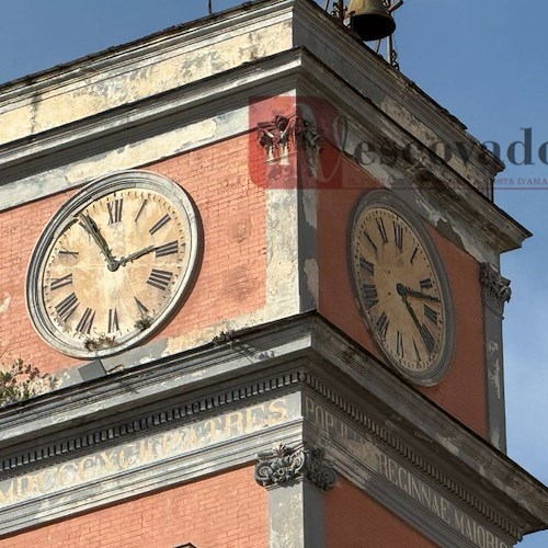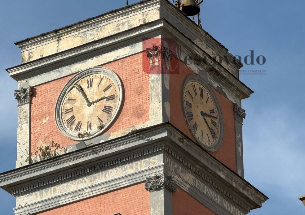 A Maiori basta alzare lo sguardo verso il campanile della Collegiata di Santa Maria a Mare per restare interdetti: i due orologi non coincidono. Il quadrante esterno è fermo da settimane e indica le 14:55, mentre quello interno - affacciato sul piazzale - segna correttamente l'ora (16:15 al momento del nostro scatto).